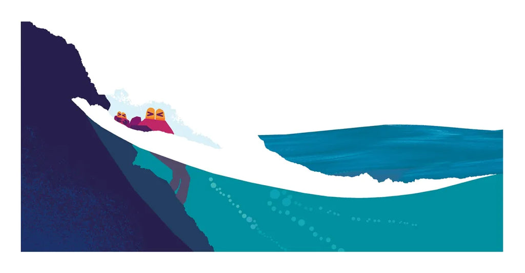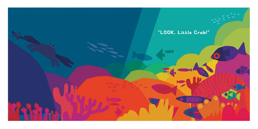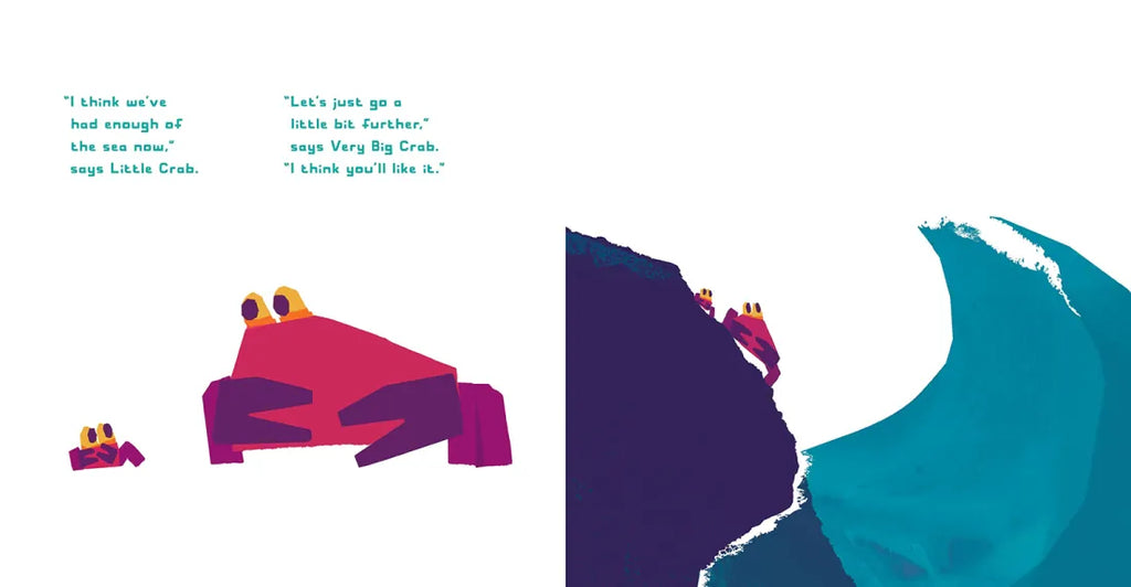 In the rockpool above the sea, live two crabs: Very Big Crab and Little Crab. Today, they’re going for a dip in the sea. “This is going to be so great!” says Little Crab. But then Little Crab catches a first glimpse of the water... Oh. The waves! They're ENORMOUS. "Oh..." Will Little Crab be brave enough to go in?