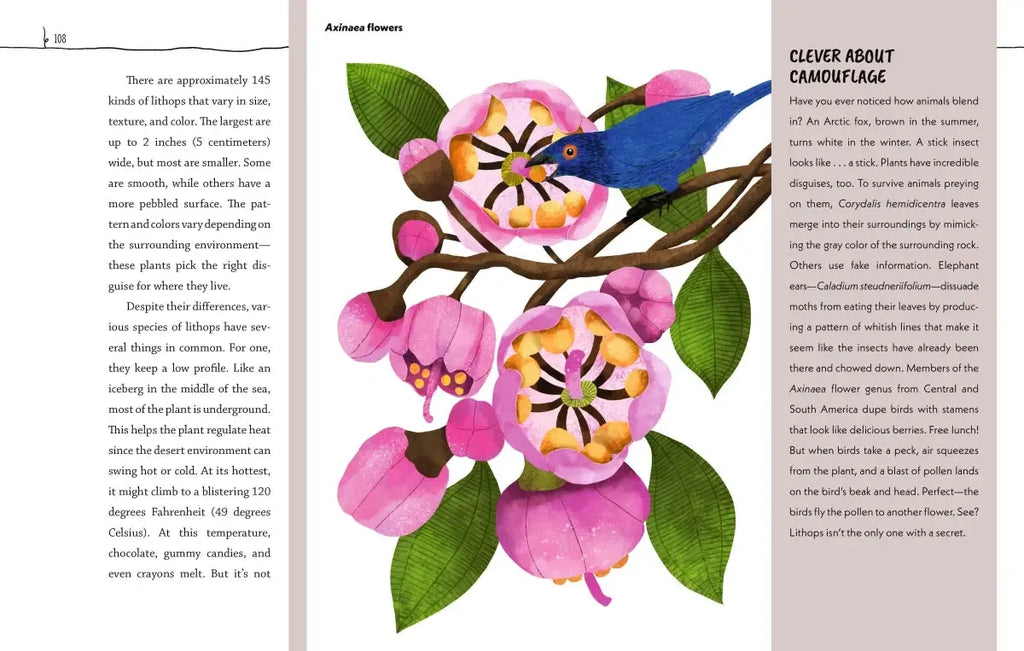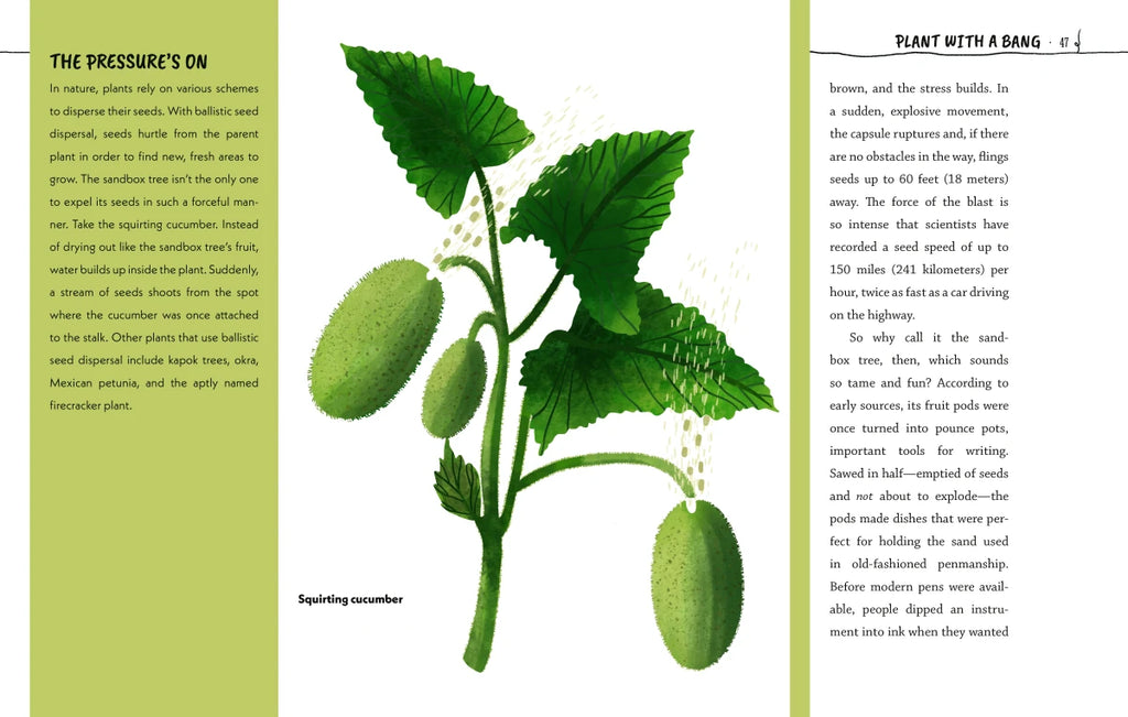 Ready to meet some far-out flora? Leaf through this book and you’ll unearth some of the amazing adaptations that help plants thrive: Seeds that explode. Leaves that look like stones. Berries so deadly that swallowing just a few will stop your heart. A plant that eats meat, and another that pretends to be meat—rotten meat, with a smell so rank you’ll want to plug your nose. Dig in to the science of plant survival in a botanical book blooming with lush illustrations and filled with engagingly narrated, fascinating facts about how plants flourish, even in the most extreme environments on earth. A glossary, source notes, index, and select bibliography round out the back matter for readers eager to know more.