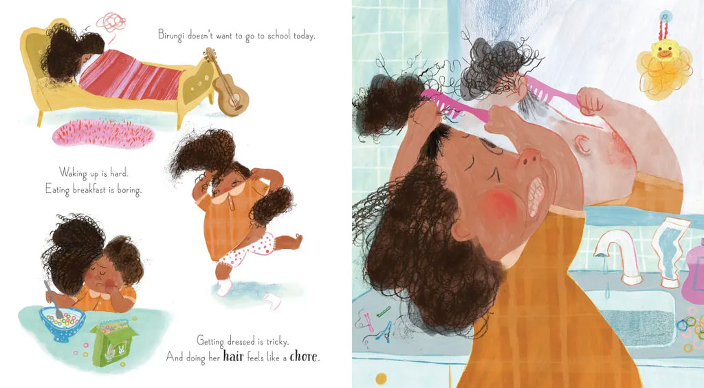 Birungi doesn’t want to go to school today. Waking up is hard, but doing her hair is harder. “I hate my hair!” she declares. “It’s just no good.” Luckily, Birungi’s parents know the secret to good hair. As they walk through town, they show her that hair can be black, gray, blond, or sometimes even blue. It can reach for the sky or fall straight to the ground, be worn in rows or curls, twirl or kink or flow or frizz. There are as many different types of hair as there are different kinds of people, and each person’s hair, no matter how it grows, needs the same special care and attention as all the other wonderful parts of them. With humor, joy, and empathy, writer Yvonne Sewankambo and illustrator Freda Chiu reach out to readers who may feel frustrated by their hair, showing the power of self-love and reveling in the unique beauty of every crown.