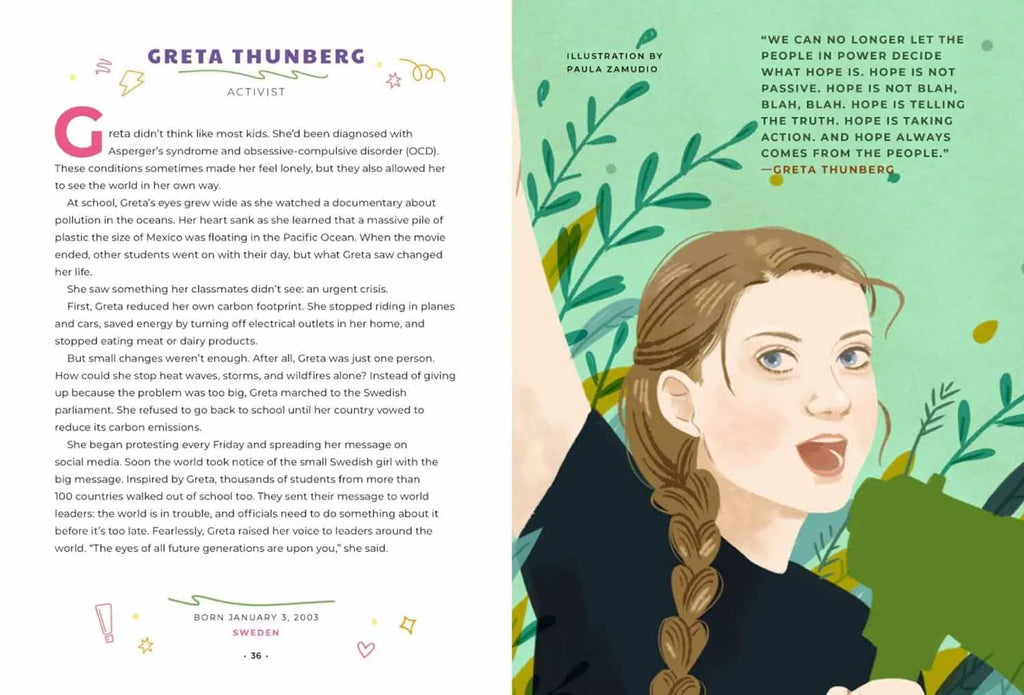 Readers will celebrate well-known women, like Greta Thunberg, Bethany Hamilton, Bindi Irwin, Zendaya, and the Linda Lindas, and meet up-and-coming powerhouses like inventor Vinisha Umashankar, fashion designer Marine Serre, stuntwoman Sadiqua Bynum, filmmaker Taegen Yardley, poet Alexandra Huynh, and environmental activist Helena Gualinga.