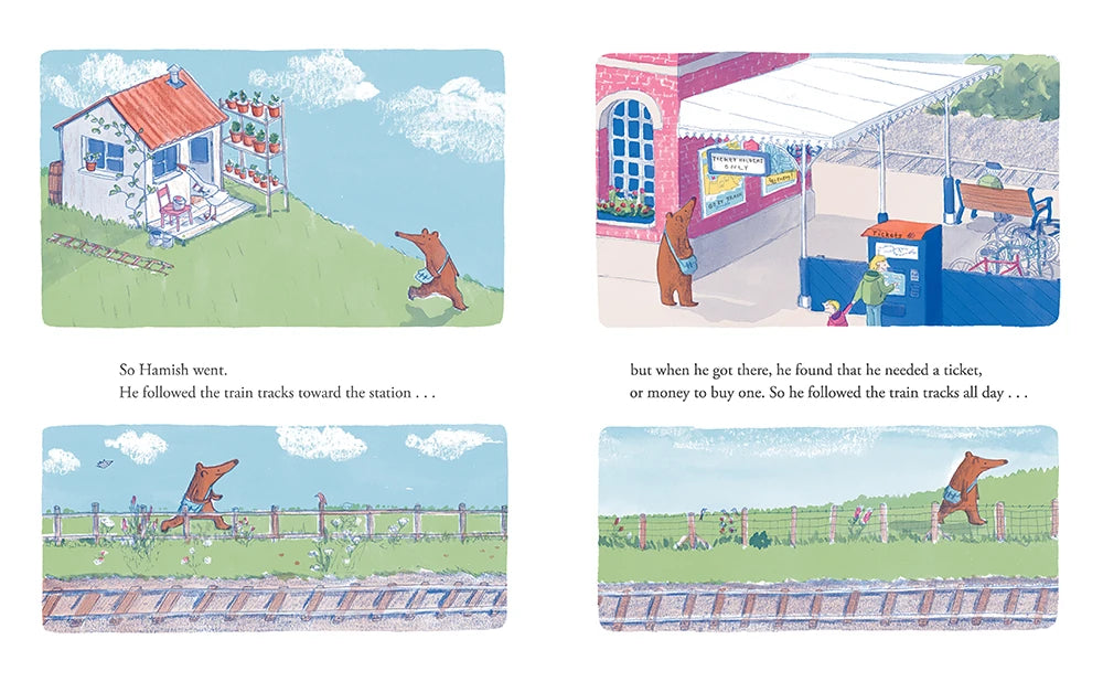 Hamish the bear and Noreen the goose live in the country, where they like to watch the trains whoosh by. While Noreen is happy to stay in the country, Hamish can’t help but wonder what it would be like to ride the train into the city. So one day he says goodbye to Noreen and sets off along the tracks. Hamish’s ride on the train takes him to new places, where he meets new friends and even gets a job on a construction site. Before long, though, Hamish realizes how much he misses his home and Noreen. From Daisy Hirst, the award-winning author-illustrator of The Girl with a Parrot on Her Head, here is a warm and friendly story about finding adventure and then finding your way home again.