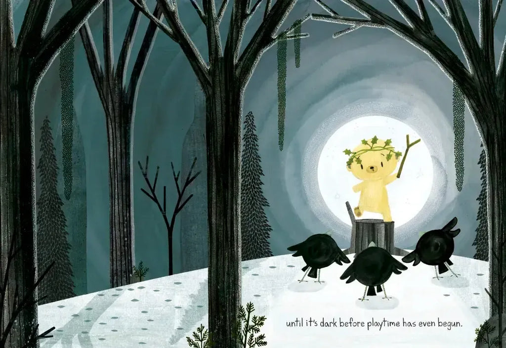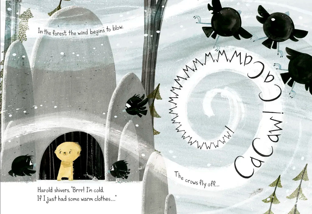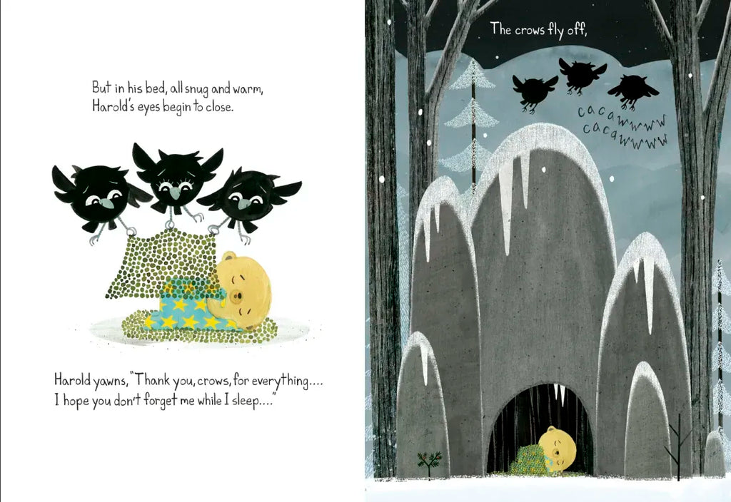Harold is determined to stay awake. So, with help from his friends the crows, he tries everything—from filling his belly with delicious berries to wearing cozy pajamas to keep him warm. Finally, snow starts to fall, and Harold finds he needs to rest his eyes, just for a minute. When he finally dozes off, the crows return—with his woolly hat—to snuggle up for some winter rest.