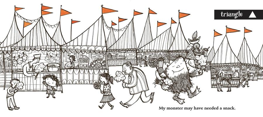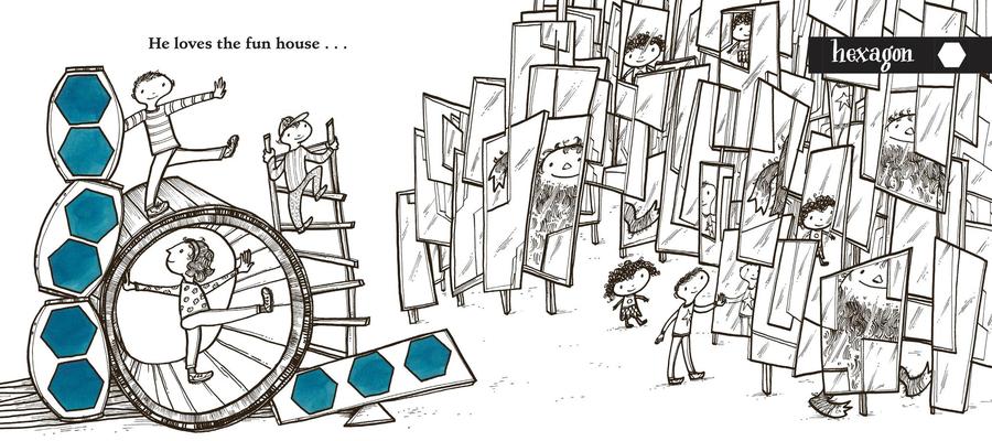 A little girl gallivants through a county fair, searching for her furry friend. Readers will surely spot the friendly monster as well as twenty shapes, identified here by their proper names—trapezoids, ellipses, kites, and more—hidden among iconic fair attractions from the fun house to the Ferris wheel. Maybe the monster is judging the pies? Or perhaps he’s at the monster-truck rally? Youngsters will be so mesmerized by Steve Light’s masterful pen-and-ink illustrations, decorated with vivid splashes of color, that they won’t even realize they’ve learned how to spot a nonagon while looking for a monster.