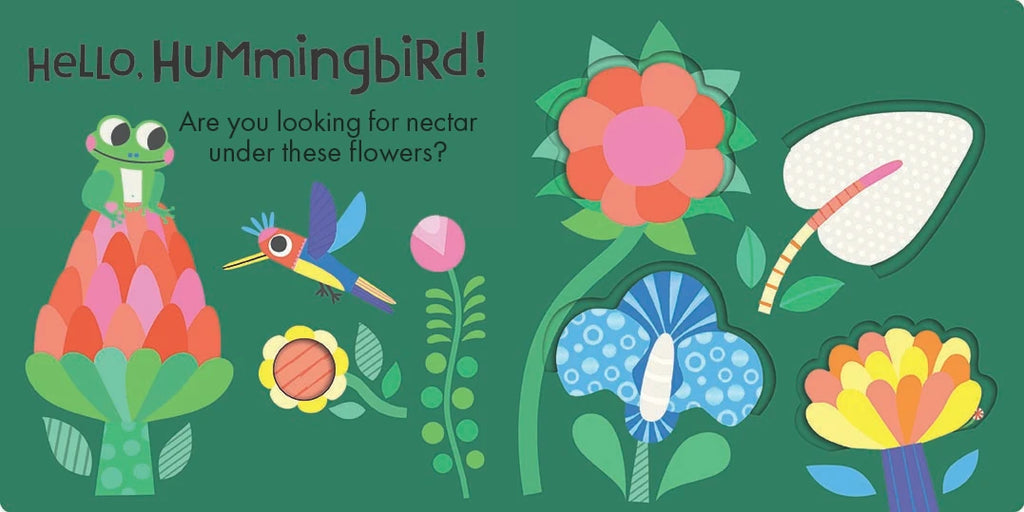 Little ones will love to join Frog on an exciting adventure around the pond and through the rainforest. Frog is sitting on a lily pad in the pond, and children can lift the flap on each lily pad to see what’s underneath. Frog then meets Hummingbird, where there are flowers to lift and peek underneath. Then he meets Snake and Monkey, and at the end of the day, Frog meets Moth before going to sleep. With die-cut, touch-and-feel textures, peek-through holes, and lift-the-flaps throughout, this book is an interactive, tactile adventure!