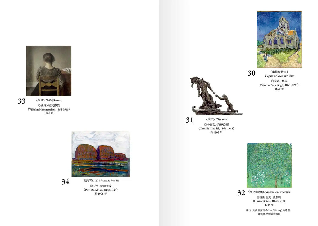 古斯塔夫.庫爾貝|亨利.方坦—拉圖爾|羅莎.博納爾|詹姆斯.惠斯勒|茱莉亞.瑪格麗特.卡麥隆|愛德華.馬內|克勞德.莫內|愛德加.竇加|保羅.塞尚|愛德華.伯恩—瓊斯|文森.梵谷|卡蜜兒.克勞岱爾|古斯塔夫.克林姆|威廉.哈莫修依|皮特.蒙德里安