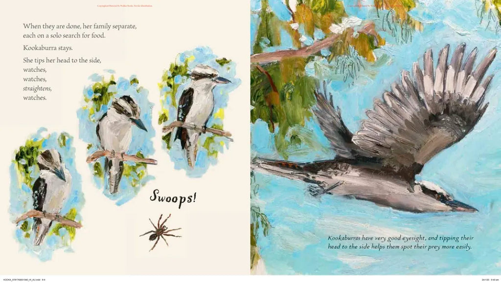 Kook-kook-kook. Kak-kak-kak. What is that sunrise chorus that sounds like laughter? It is a kookaburra and her family, calling over the river. Follow these iconic Australian birds as they search for food and team up to defend their territory in preparation for the nesting season. With rich paintings and poetic text, threaded through with intriguing facts, Kookaburra offers insight into the lives of these fascinating birds. Curious readers will find more information about kookaburras at the end, as well as an index leading them back through the book to explore these distinctive creatures more closely.