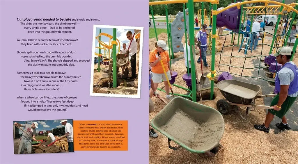 What’s your dream playground? Grab a piece of paper and let your imagination go wild! That was the first step when two hundred kids and grown-ups in an Indianapolis community got together to build the playground in this book — one of over two thousand that KaBOOM! has helped create. A slide isn’t just a slide, it could be a chute to a time machine. A swing might be Pegasus flying across the galaxy. . . . Weeks of planning precede the construction of a playground that a community feels is truly theirs, a vibrant space to foster both creativity and physical activity. Sprinkled with kid-friendly factual notes, Michael J. Rosen’s lively free verse, together with colorful photographs, capture the enthusiastic teamwork leading up to the final build of a playground in one day — a playground that will welcome kids of all ages well into the future.