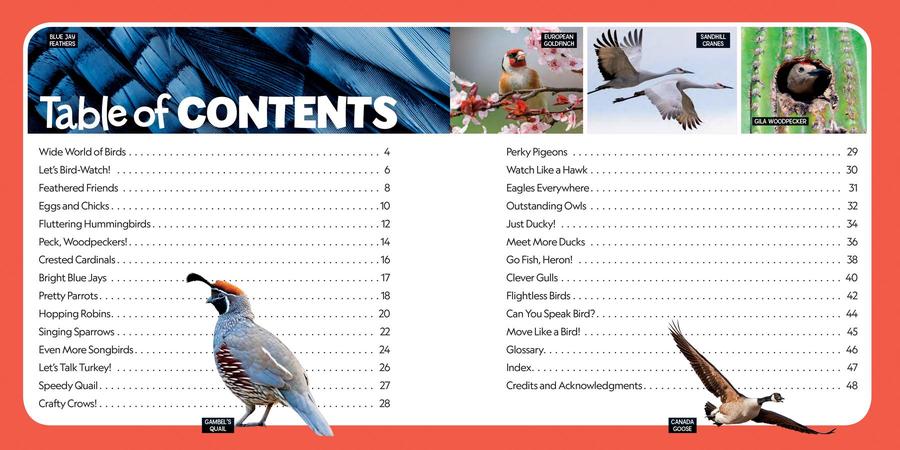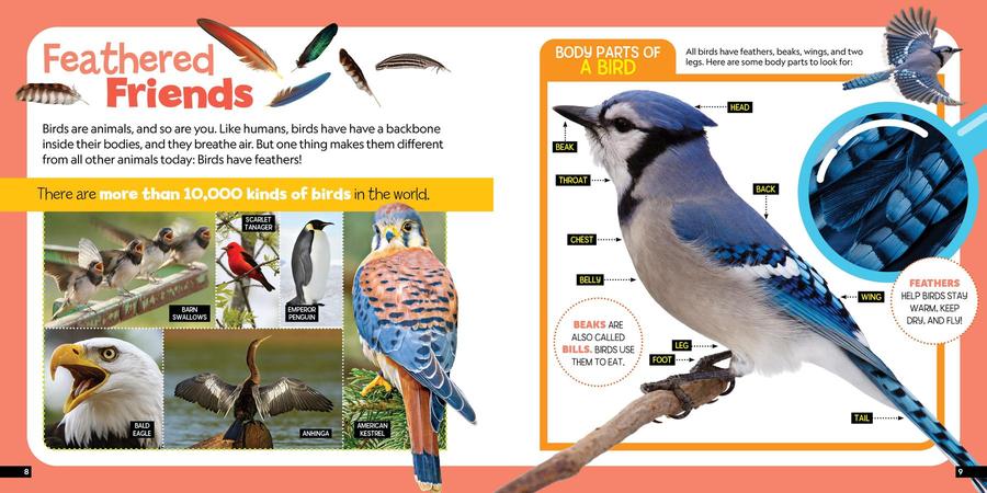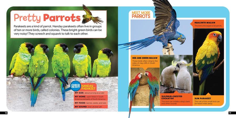 In this companion to the best-selling National Geographic Little Kids First Big Books, little explorers get to know a variety of common and not-so-common birds through vibrant photos and easy-to-understand profiles. Young explorers can use this sturdy take-along guide to identify birds by their size, coloring, and even their sound, from the kee-kee-kee of a pileated woodpecker to the gobble-gobble of a wild turkey. Readers will also learn about the parts of a bird, their nesting habits, and their stages of growth, from egg to bird. Fun games and a glossary will get little bird-watchers up and moving, walking the walk, and squawking the squawk!