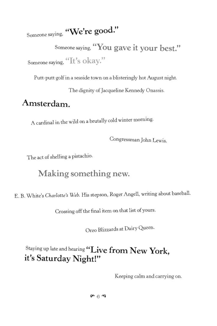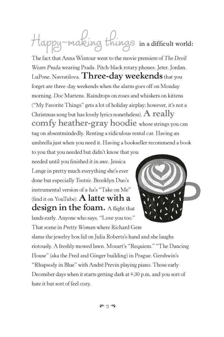Need a pick me up to brighten your afternoon? Skip that second cup of coffee and discover dozens of happy-making lists alongside short essays, musings, prompts, quotes, and playlists. Flip to the joys of red velvet cake or road trips—or dip into “Things You Might Consider Doing Today” (Call a friend and don’t use the pronoun “I” during the entire conversation) or “Things to Look Forward To” (Reaching the other side of something challenging - which you will!) or “That Song … You Know the One.”
