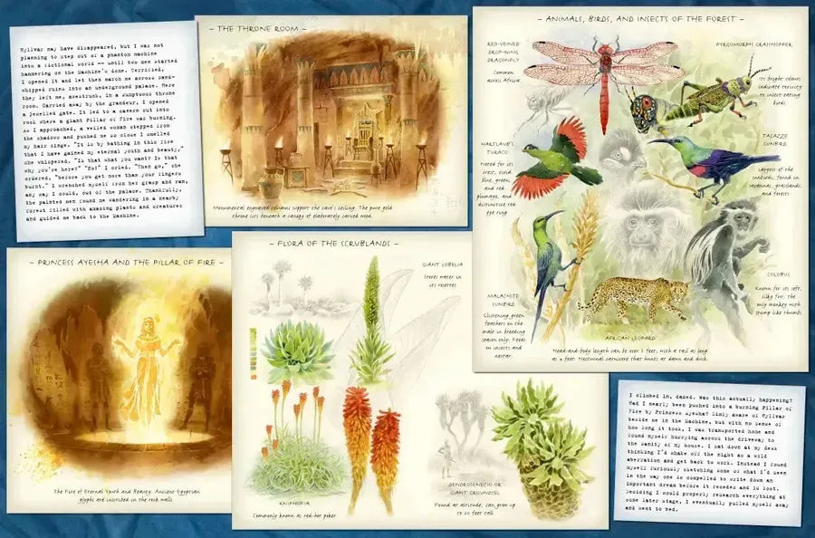 Enter the elaborate “found” notebooks of the formerly fact-bound professor Dawn Gable and follow her on nine nightly journeys to extraordinary worlds. From King Arthur’s Round Table at Camelot to the majestic hall of slain heroes in Asgard, visit marvelous lands from myth, legend, and fairy tale. Intricate vistas and diagrams usher readers into a city of intelligent machines, the ancient African city of Kor, the miniature world of Lilliput, the flying island of Laputa, a mountainous home of mythical beasts, the primeval island of Buyan, the island of Atlantis, Captain Nemo’s Nautilus, and more. A mesmerizing gift for anyone who believes in the transformative power of stories, this is a book that readers will pore over again and again.