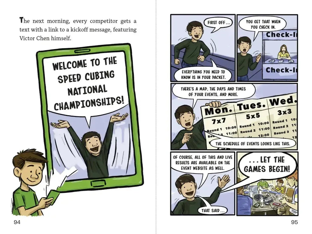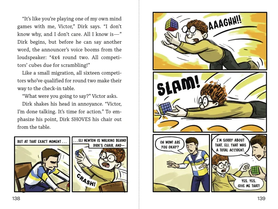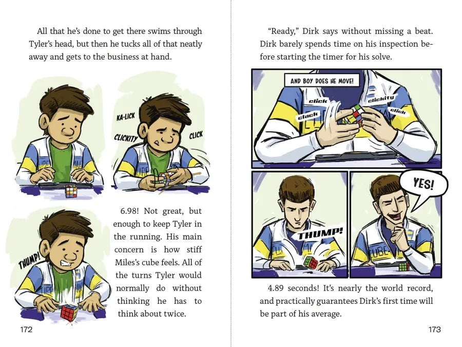 Despite qualifying for the Speed Cubing National Championships in Las Vegas, twelve-year-old Tyler Goodman and his mom don’t have the money to get him there. That is, until the retailer CubeMania offers him one of their coveted all-expenses-paid sponsorships! But getting to Vegas is just the beginning: There are hundreds of speed cubers from around the country, and each has something to prove. Like Dirk, who's certain he's about to nab his third straight National Championship trophy. Lizzy and Izzy Peterson, twins who crush cubing competitions with the exact same moves and times—until one of them decides to break the mold. Renowned eight-year-old prodigy Eli Newton solved his first puzzle cube at five, yet his dad seems much more excited about the sport and there’s something . . . off about his cubes. And then there’s Miles Oldman, the first American to solve the cube in under 40 seconds, who’s back decades later to set some new records. As Lucky Scramble moves with lightning speed between the stories of these six contestants—plus that of CubeMania’s founder and CEO Victor Chen—puzzle cube devotees and fans of graphic novels alike won’t be able to resist racing through the pages until the very last cube has been solved.