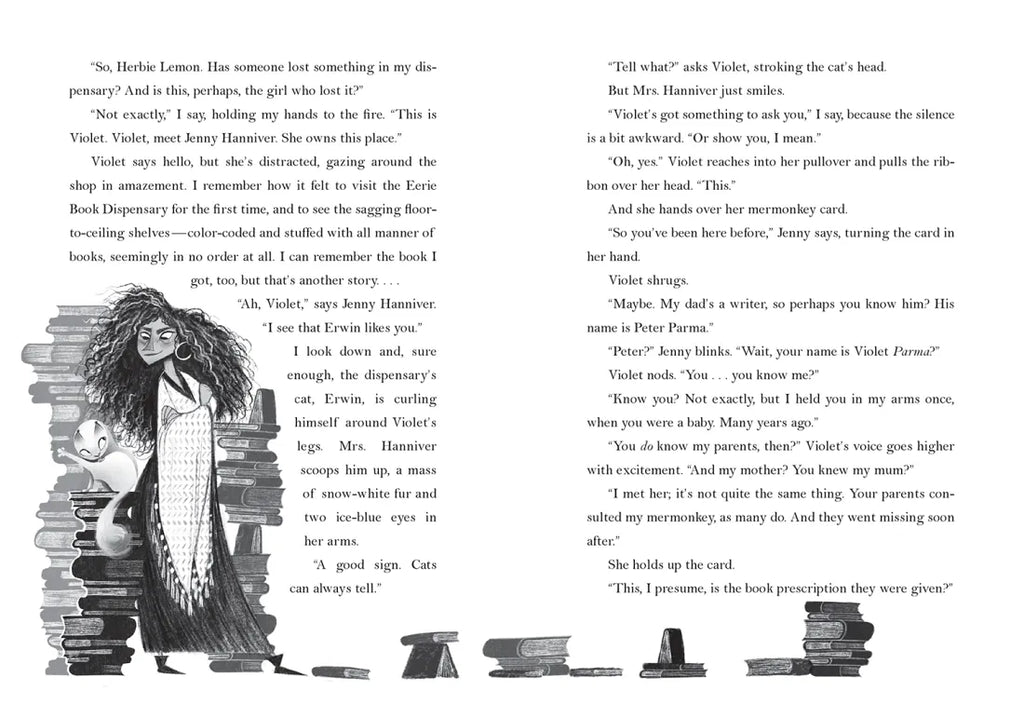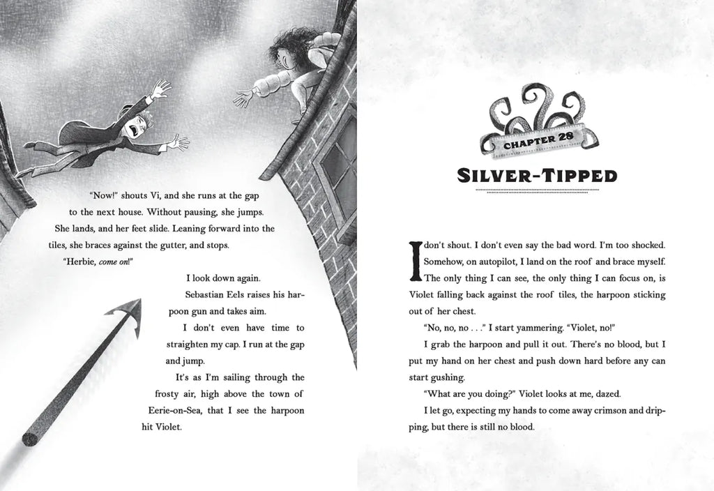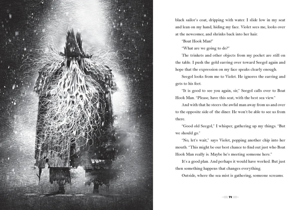 It’s winter in the town of Eerie-on-Sea, where the mist is thick and the salt spray is rattling the windows of the Grand Nautilus Hotel. Inside, young Herbert Lemon, Lost and Founder for the hotel, has an unexpected visitor. It seems that Violet Parma, a fearless girl around his age, lost her parents at the hotel when she was a baby, and she’s sure that the nervous Herbert is the only person who can help her find them. The trouble is, Violet is being pursued at that moment by a strange hook-handed man. And the town legend of the Malamander — a part-fish, part-human monster whose egg is said to make dreams come true — is rearing its scaly head. As various townspeople, some good-hearted, some nefarious, reveal themselves to be monster hunters on the sly, can Herbert and Violet elude them and discover what happened to Violet’s kin? This lighthearted, fantastical mystery, featuring black-and-white spot illustrations, kicks off a trilogy of fantasies set in the seaside town.