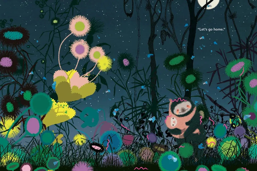 Baby sloth lives high up in the trees with his mama, where he loves to sleep between her and the moon. But one night he tumbles from her arms to land in a soft patch of leaves far below. “I’ll be there soon,” Mama sloth calls down to him. But sloths never get anywhere soon. When Baby becomes worried, Mama finds clever ways to reassure and distract him using his senses of sight, sound, smell, and touch.