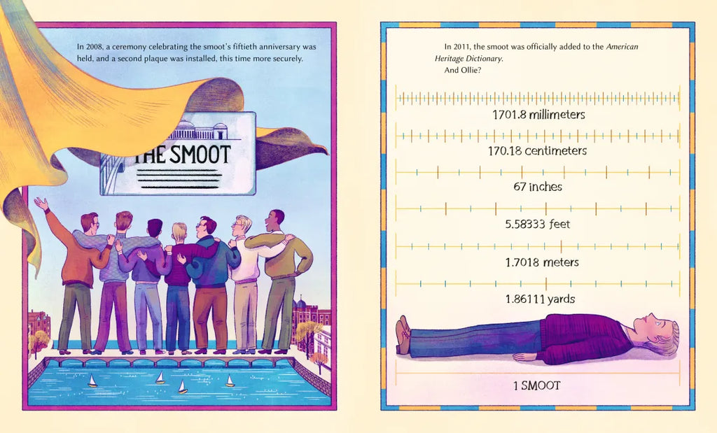 When the five-foot-seven-inch Oliver Smoot and his friends at MIT decided to play a practical joke, he drew the short straw—and was selected to be the measurement device to carry it out. The task? Measuring the length of a bridge, one lying-down Oliver Smoot at a time. Author Jenny Lacika playfully introduces the idea of nonstandard measurement in this story about the creation of a new unit: the smoot. Anna Bron captures the hijinks of college kids having some fun, getting into trouble, and in the end, making math history. Measuring Up invites readers over to the sillier side of mathematics and encourages them to play with measurement in their own lives. As for the smoot? This unorthodox unit of measure is now cemented into history, in sidewalk markings on a certain Cambridge-to-Boston bridge. Find out more about smoots, MIT pranks, unusual measurements, and further reading in the back matter.