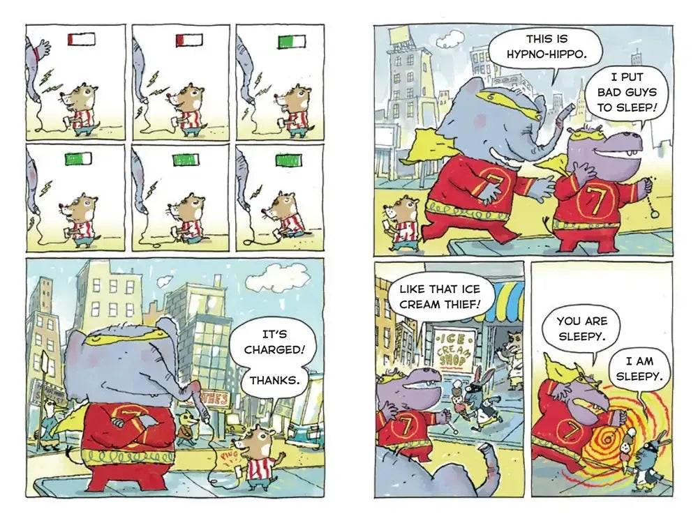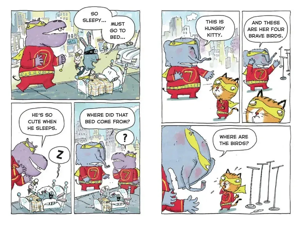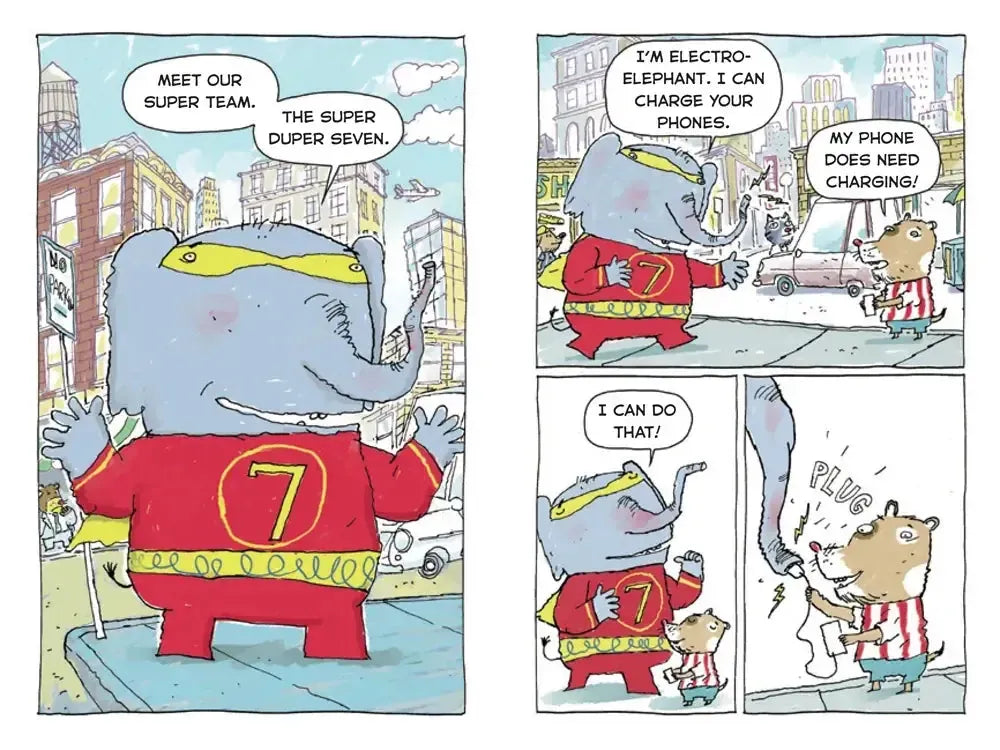 Meet the Super Duper 7! Electro-Elephant can charge your phone. Hip-No-Hippo can put bad guys to sleep. And Hungry Kitty and her four brave birds . . . . But where are the four brave birds?