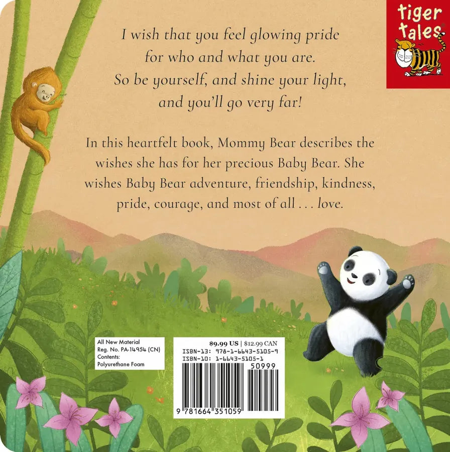 In this heartfelt book for children ages 2-5, Mommy Bear describes the wishes she has for her precious Baby Bear. She wishes Baby Bear adventure, friendship, kindness, pride, courage, and most of all . . . love. The soft padded covers make for a cozy, comfy read with little ones.
