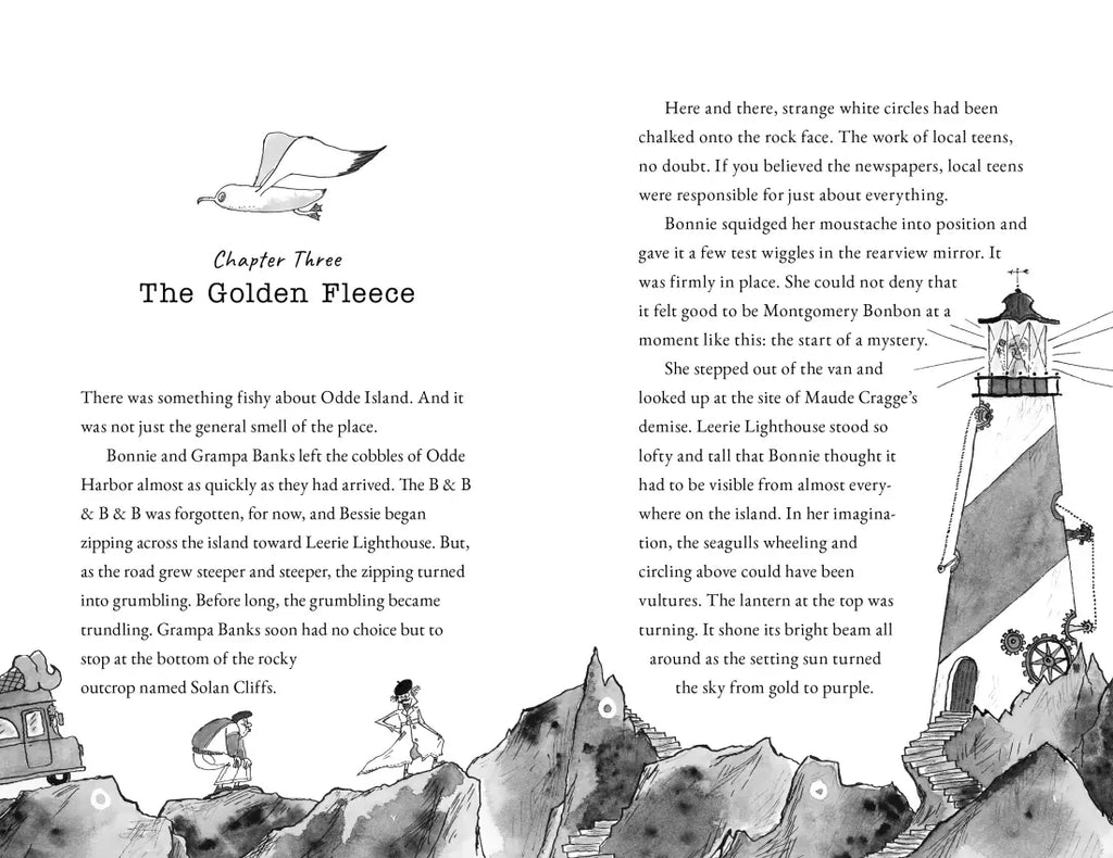 Bonnie Montgomery is finally getting a vacation from cracking cases as her alter ego, Montgomery Bonbon.But something terribly fishy happens the moment she and Grampa Banks arrive on Odde Island—and it’s not just the smell of the harbor. There’s been a mysterious death at the lighthouse, and what everyone assumed was an accident is setting Bonbon’s mustache all aquiver: something is Highly Suspicious. When a second death takes place, Bonnie is sure the two are connected. But can she solve this case alone, or will she need double the detectives to solve double the murders?