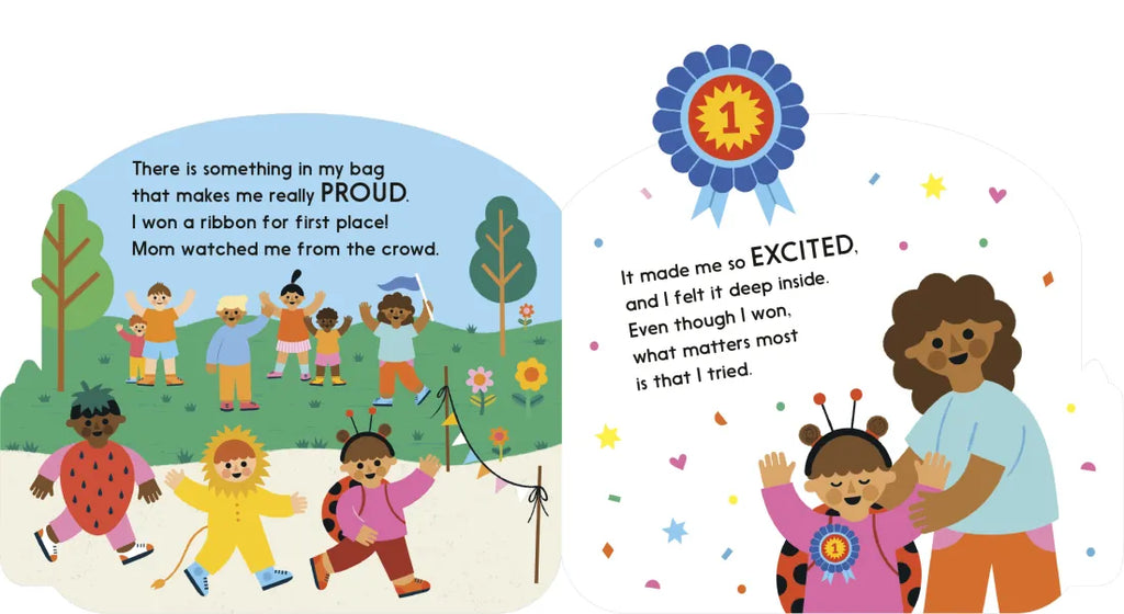 This innovative shaped board book introduces a child who describes the objects inside their bag that remind them of the different emotions that they've experienced.