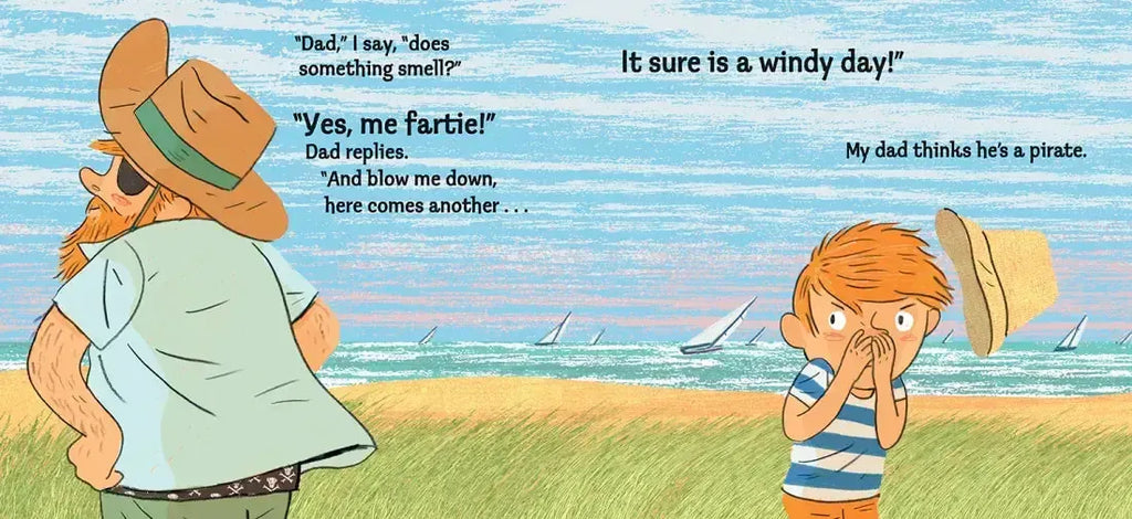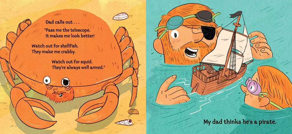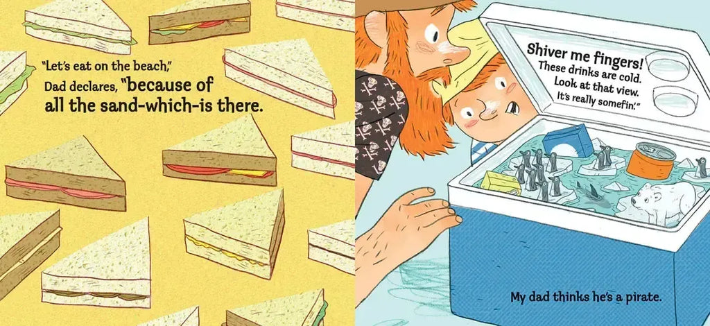 Captain Dad and his crew are having a day at the ocean, and of course Dad is bringing his treasure chest of jokes. Aye-aye, you say? Just one eye, Dad corrects, pointing to his patch. Why does he like to eat on the beach? Because of the sand-which-is there, he explains. Whether it’s a ship he bought on sail or an earring that costs one buccaneer, a day with Dad is shore to be hilarious. At least he seems to think so!