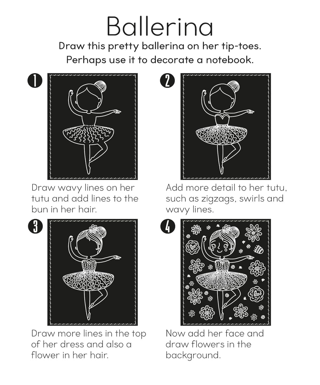 This activity book includes lots of sparkly pictures for children to create by scratching off the black surface on the page. Each picture has an outline to get the reader started and sparkly details are then revealed by following easy step-by step instructions. The book features an integrated wood stylus perfect for scratching details onto the pictures. Pages can be easily pulled out the book to display or create fun sparkly crafts. A great way to develop a child’s sequencing and fine motor skills, as well as encourage creativity and imagination!