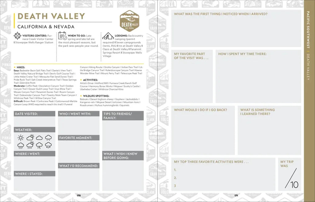 The ultimate road trip companion, this keepsake diary will help you chronicle your journey to all 63 U.S. National Parks. Special features include a map to check off each park you visit, helpful tips and tricks for planning, guided prompts to capture your favorite memories, and journaling space. Inside you’ll find: