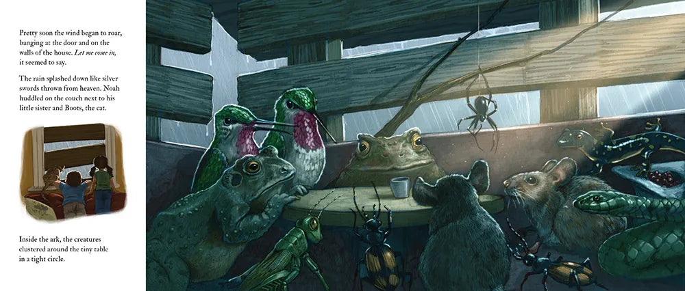 While his family readies his townhouse for an approaching storm, boarding up windows and laying in groceries, Noah heads to the back garden, where beetles are burrowing deeper into the bark and mice are stuffing their hole with moss. Quickly and efficiently, Noah sets to work building an ark for them and other backyard creatures — salamanders and toads, snakes and spiders, even brightly colored hummingbirds. Setting out fistfuls of nuts and leaves, berries and seeds, the boy props a flashlight inside and arranges some miniature furniture for the animals to sit or sleep on. “Come,” Noah whispers to his friends just as his mother calls him inside and the dark storm roars in. From an award-winning author and a Caldecott Honoree comes a quietly inspiring story about how taking action on behalf of our fellow earth travelers can help us face fearsome events.