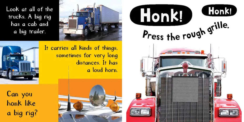 Touch, feel, and hear the trucks on every page of this sturdy board book. Engaging photographs and appealing textures encourage young readers to explore the exciting world of trucks. Press the touch-and-feels to hear five realistic truck sounds, with a button on the last page to play all five sounds again!