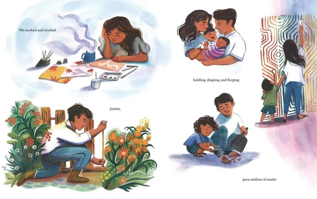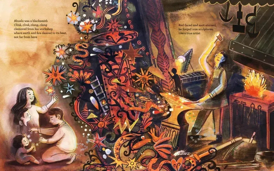 Mamá tells her children a story that began when their papá was a niño, not far from here. Their abuelitas told stories of their antepasados, and their abuelo, a blacksmith, taught their papá how to make art from earth and fire. When abuelo died, papá took all those lessons to heart and crossed la frontera to el norte to follow his sueños. There, he worked and overcame barriers, known to many immigrants alike, to forge his own obra maestra: a familia and a future in which anything is possible. Debut author Nydia Armendia-Sánchez relays a story of immigration, creativity, and comunidad through a translanguage text that moves naturally from English to español and back in a manner that will be familiar to many second and third generations of Latine families—and evocative to immigrant families of any heritage. Brilliantly brought to life by Devon Holzwarth’s rich, imaginative illustrations, this warm abrazo of a book features a glossary of Spanish words.