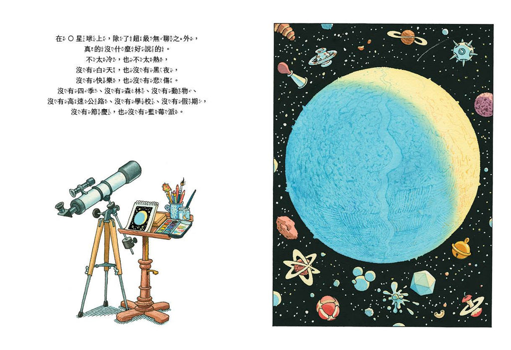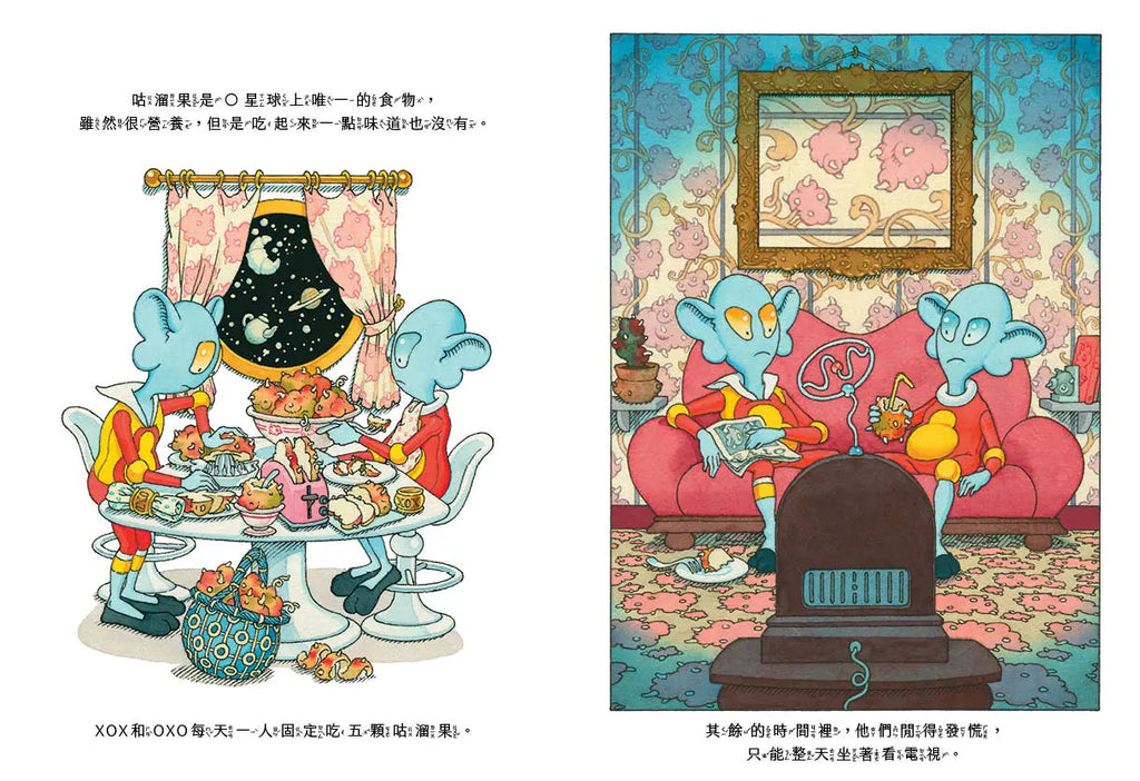 這個故事建立在一個想像的O星球上(但不能否認它可能存在於宇宙某處),作者用極富創意的視角,為我們打造了一個超乎想像的世界觀,連星球的食物「咕溜果」都有圖鑑式的描繪!