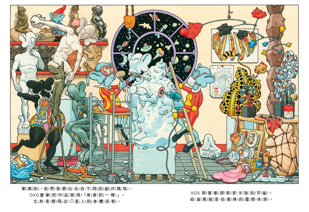 在故事後面兩個主角開始沉迷於創造之後,我們可以在插圖中發現各種熟悉的「地球藝術品」被改成了O星球的風格,讓人會心一笑,讚嘆作者的創意翻玩!