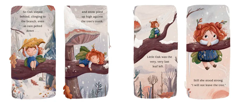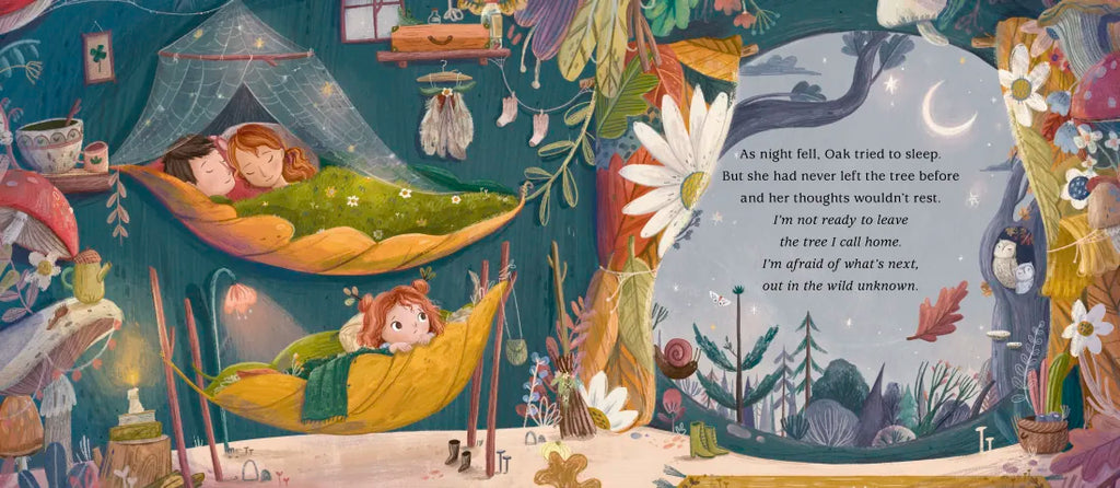 High up in the leafy branches of a tree lives a leaf girl named Oak and her family. Oak loves nothing more than playing with her animal friends of the forest—dancing with Squirrel and holding toadstool tea parties with the bumbling bugs. But as the season begins to change, and a slight chill fills the air, the usual bustle of the tree begins to slow. As winter approaches and the family prepares to make their annual move from the tree to an acorn on the forest floor, Oak doesn’t feel ready to leave and stubbornly clings to her branch. But soon the glowing light from the acorn below beckons, and she realizes that change is just an opportunity for new adventures—and that the meaning of home is wherever loved ones are.