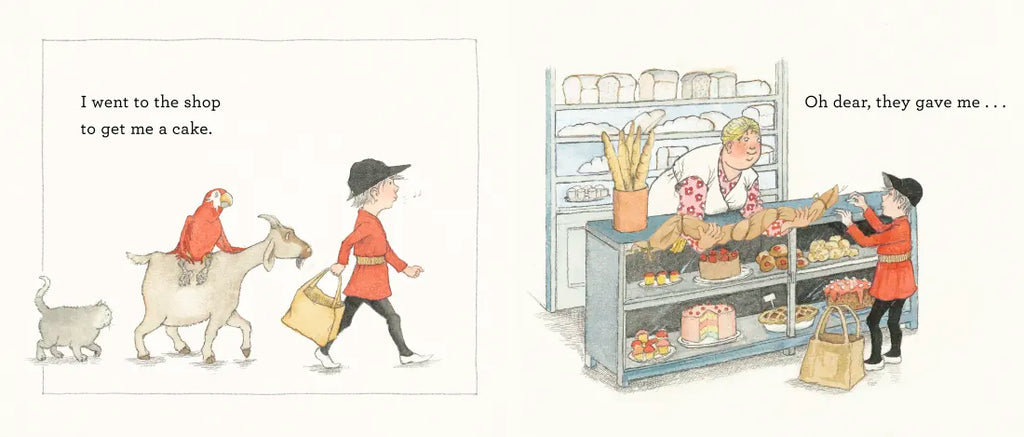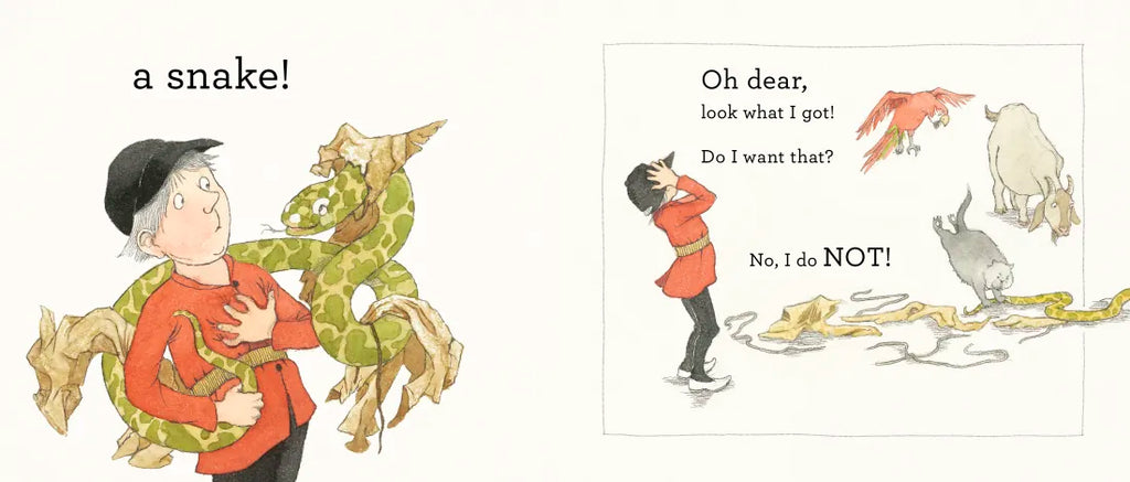 As a hapless boy goes from shop to shop, requesting a series of perfectly reasonable items—a hat, a coat, a cake, a chair—he finds himself thwarted at every turn, amassing instead a growing menagerie of animals who happily follow him on his errands. It’s not until he finally asks for a cup that he’s proffered a wriggly creature that solves his dilemma . . . or does it? Adding delicious momentum to Michael Rosen’s rhymes (and mastery of the page turn) are an expressive crew of animal characters rendered as only Helen Oxenbury can, making for a timeless story guaranteed to beg many repeat readings. Oh dear!