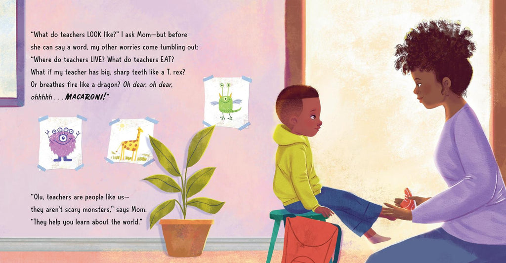 Olu is nervous about going to school for the first time—his legs are shaking and his tummy feels wobbly. He knows his friends will be there, but he doesn’t know what the teacher will be like. What do teachers look like? Where do they live? What do they eat? What if his teacher breathes fire, like a dragon? Ohhhhh . . . MACARONI! Luckily for Olu, his parents talk to him about teachers, assuring him they’re just people who help you learn about the world. But as Olu walks with his mom to school, he is still anxious. What will his teacher be like? Early childhood educator Jamel C. Campbell addresses a common fear that children all over the world experience at the start of a new school year in a sweet, reassuring story paired with the gentle, welcoming illustrations of Lydia Mba. An author’s note addressed to grown-ups explains that meeting children’s needs in times of transition helps to build confidence, resilience, and openness to future exploration.