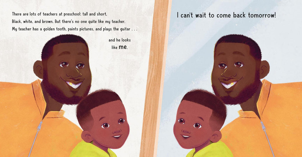 First-day-of-school fears are eased when a child discovers his new teacher is warm and approachable—and looks like him—in a tender picture-book debut.