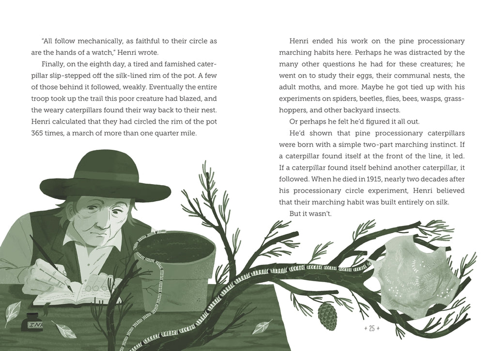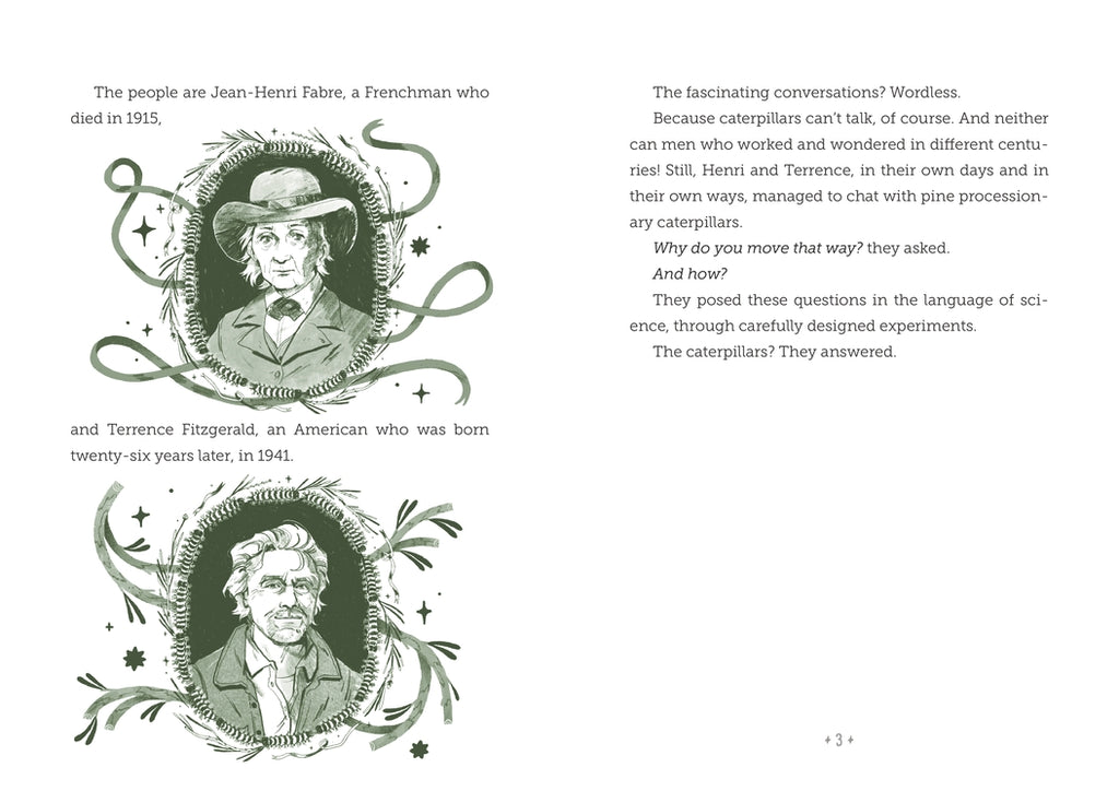 This is a story about remarkable creatures, inquisitive people, and fascinating conversations. The creatures? Pine processionary caterpillars with mysterious group habits. The people? Jean Henri Fabre and, many years later, Terrence Fitzgerald—scientists with big questions about the behavior of these caterpillars. And the conversations? The conversations span lifetimes, as one researcher continues a dialogue started by the other. In this playful, candid, and accessible book for young readers, biologist Loree Griffin Burns captures the unique leader-follower behavior of pine processionary caterpillars through a glimpse into the “ask, test, repeat” nature of the scientific process—and shows how that process creates one long line of questioning and learning. Back matter includes more details about the two scientists as well as a glossary, bibliography, source notes, and suggestions for further reading.