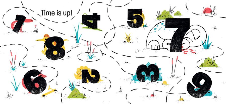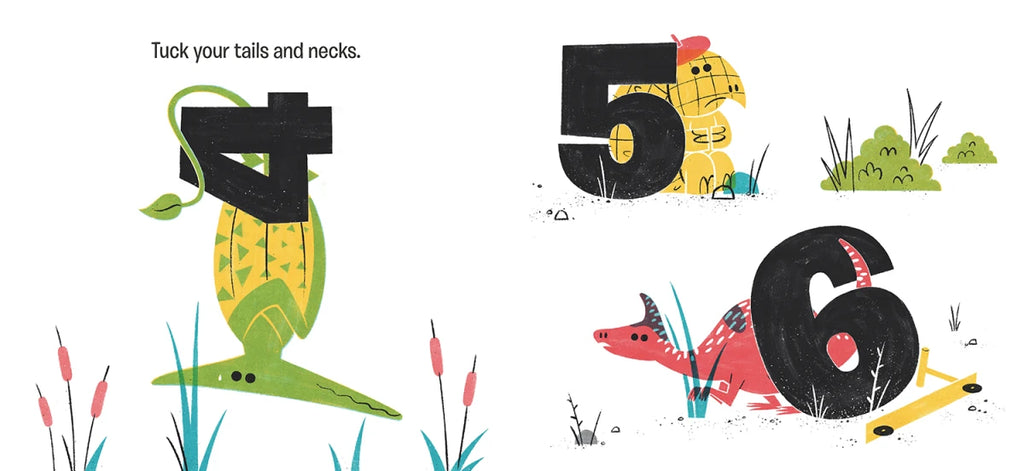 Look there, in a child’s bedroom, where some prehistoric pals are gathered in a counting game. Nine dinosaurs are playing a singsong rendition of hide-and-seek—but something isn’t adding up. Where is number ten? Stomp, stomp, stomp! CHOMP, CHOMP, CHOMP! Ready or not, here he comes, and he sounds . . . big! With bold numerals, an array of dinosaurs in comical poses, and a humorous twist at the end, this tribute to a child’s imagination makes learning numbers a gigantic treat.