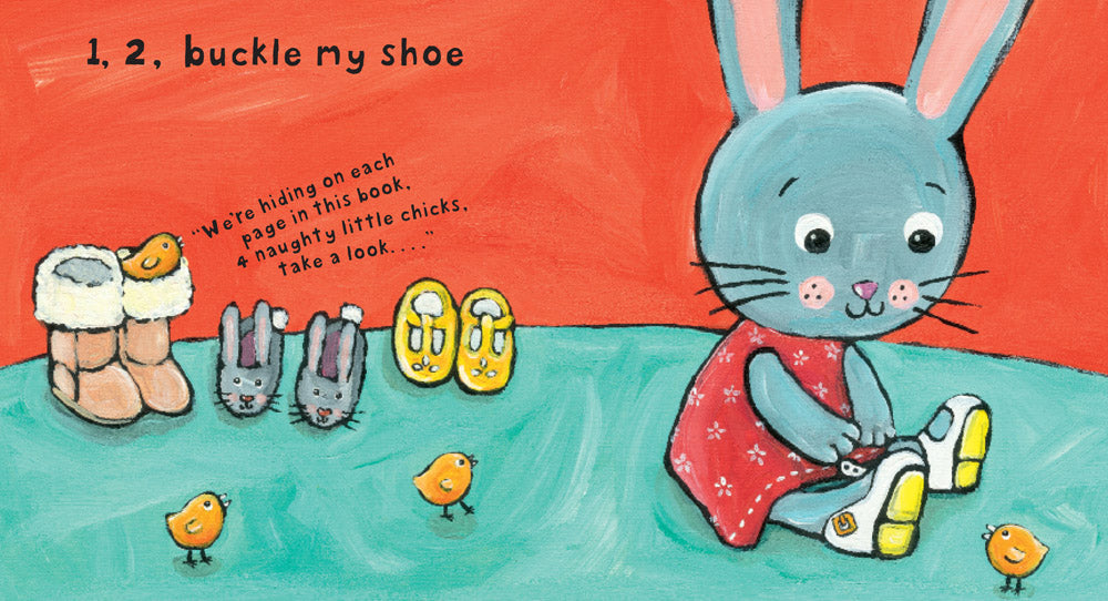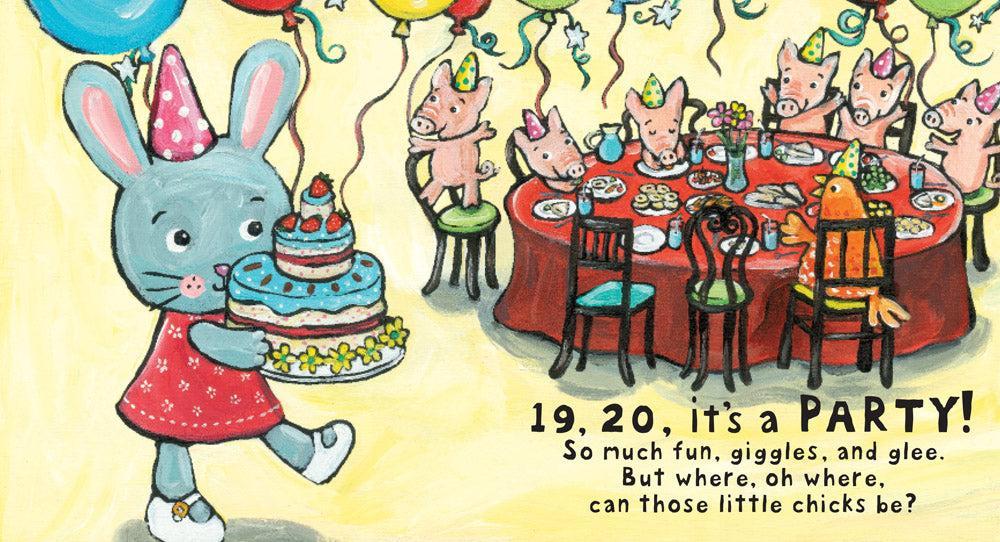 Parents' newest story hour pick is a seasoned favorite counting rhyme with an exciting twist. Rabbit needs to one, two, buckle her shoe and three, four, run out the door so she can help her neighbor Mommy Hen prepare a yummy surprise for the little pigs' birthday party. Meanwhile, Mommy Hen's four little chickes are playing hide and seek. Can you count to 20 with Rabbit and keep track of those sneaky chicks at the same time?