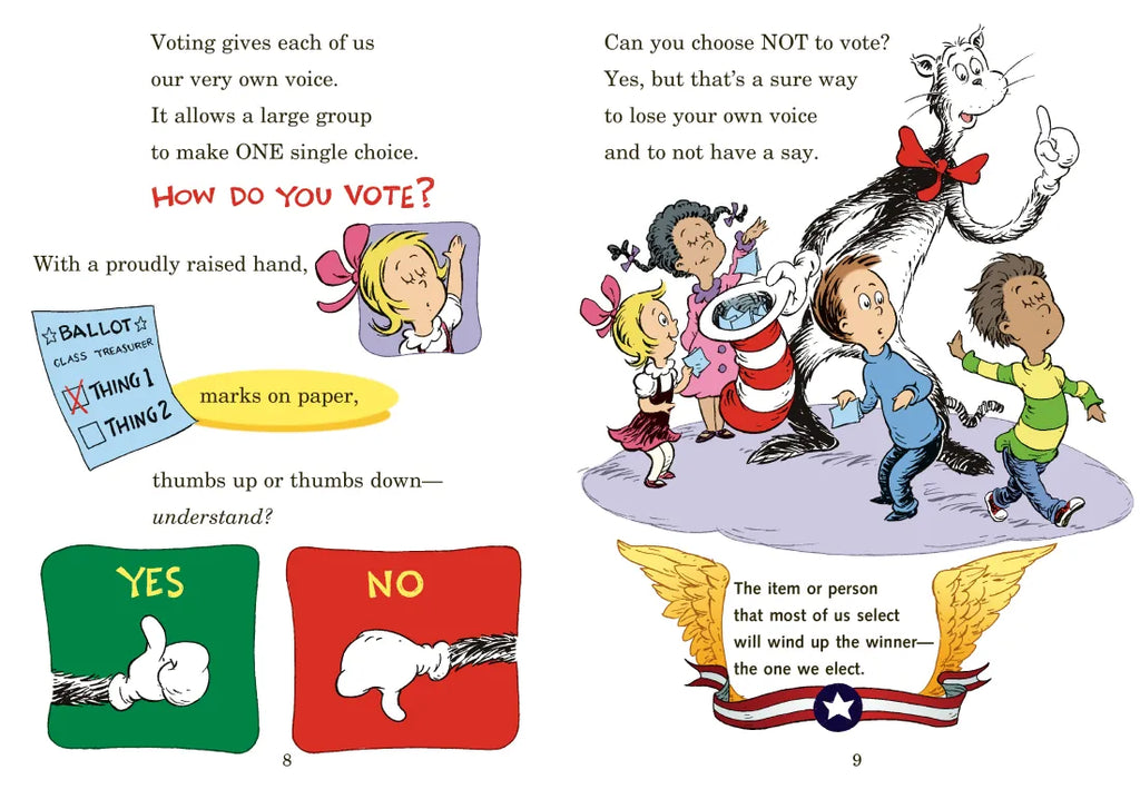 The Cat in the Hat’s Learning Library series combines beloved characters, engaging rhymes, and Seussian illustrations to introduce children to non-fiction topics from the real world! In this kid-friendly guide to voting, readers will learn: