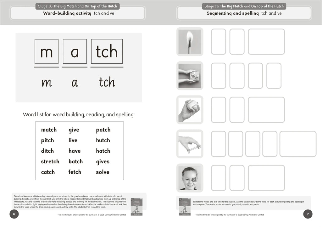- A carefully structured progression through each stage, gradually introducing the spellings ‘tch’ and ‘ve’ and simple two-syllable words.