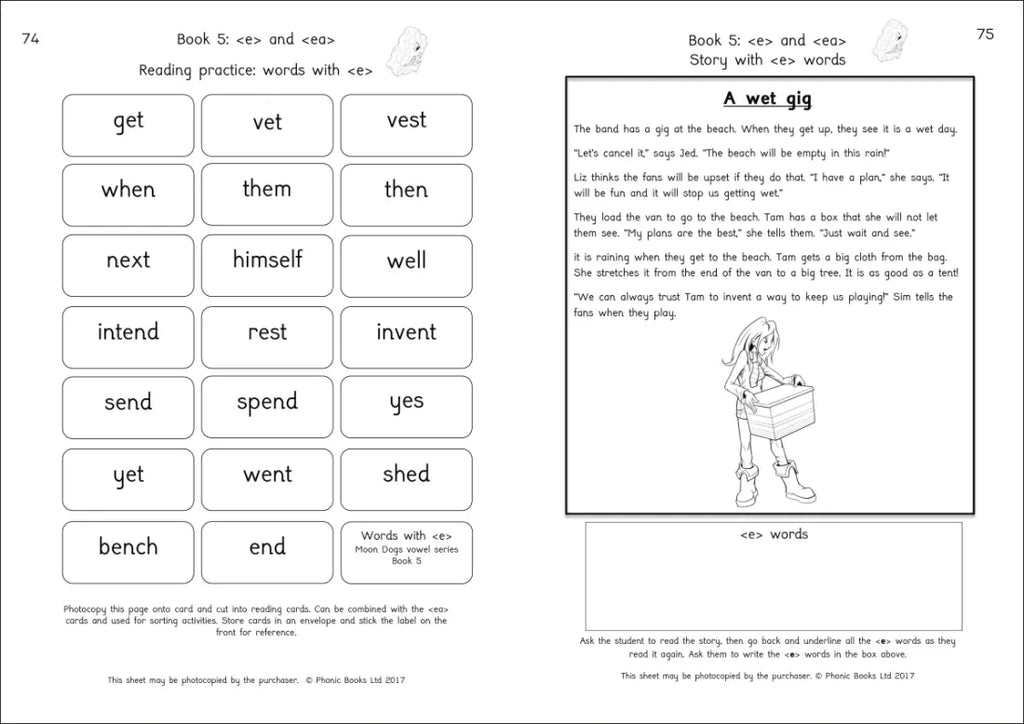 Photocopiable activities to accompany the set of 14 books in Phonic Books Moon Dogs Set 3:Vowel Spellings, decodable phonics books for structured literacy intervention with older readers. This activity book includes activities for word building, reading, spelling, grammar, vocabulary and comprehension linked to the Moon Dogs Set 3: Vowel Spellings books (ai, ay, ee, ea, oa, ow, ur, ir, e, ea, ow, ou, oo, ue, igh, i, oo, oul, a, aw, oy, oi, ar, air, are, ear, eer).