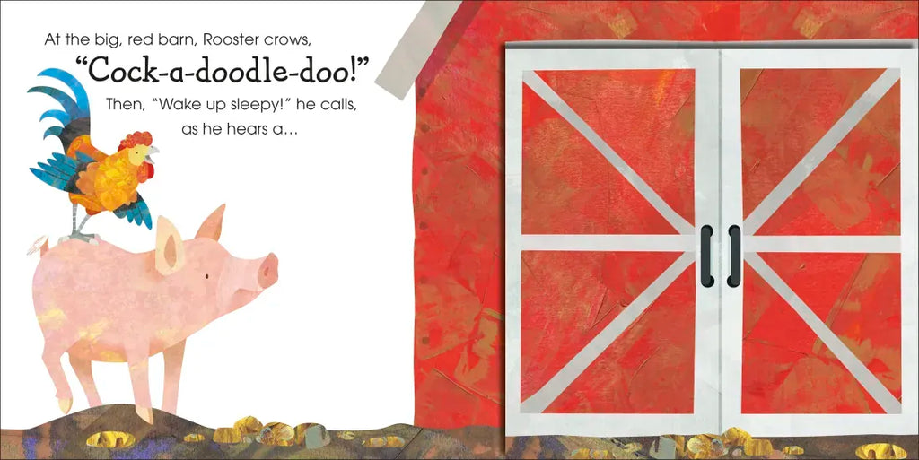 Lift the flaps to wake up the animals on the farm, and look out for the pop-up surprises! Join the noisy rooster as he visits pigs, cows, and more on a beautiful morning on the farm, in this lovely interactive board book.