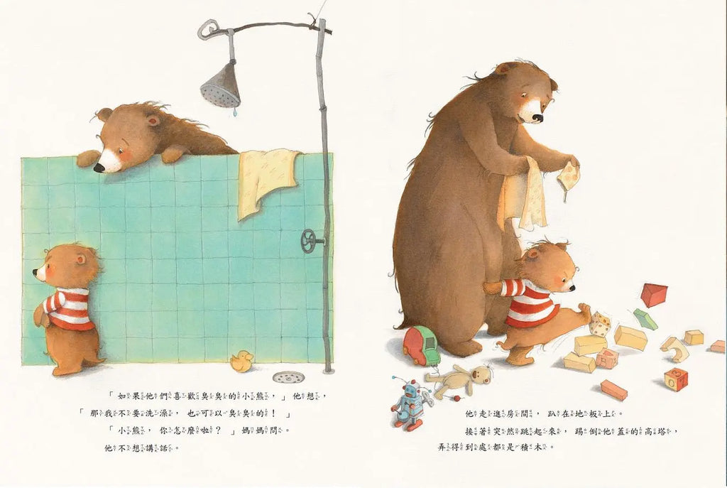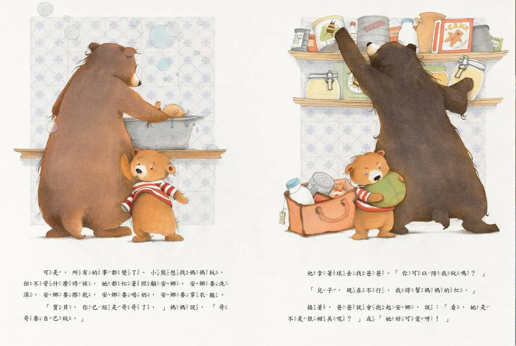 可是很快的,小熊發現事情不如想像中的美好,爸爸媽媽不再只是屬於他一個的,原本可以獨佔的擁抱也都變成小寶寶的,甚至爸爸媽媽為了小寶寶而不再有時間陪他玩遊戲。