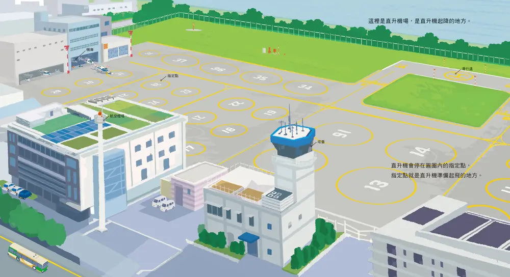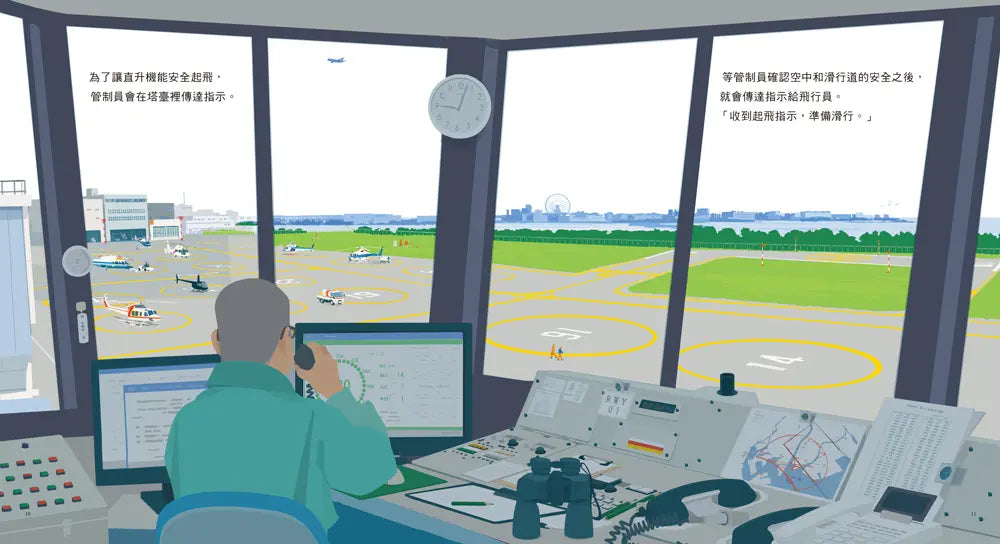 本書以直升機從直升機場起飛的步驟開始,簡介直升機場、塔臺,介紹直升機最特殊的飛行技巧──懸停,以及直升機的內部。並帶領讀者看到直升機常見的用途,如:協助運送貨物、空中錄影,執行救援行動,書中場景皆參考實際的直升機出勤狀況所繪,是認識直升機的最佳入門繪本!