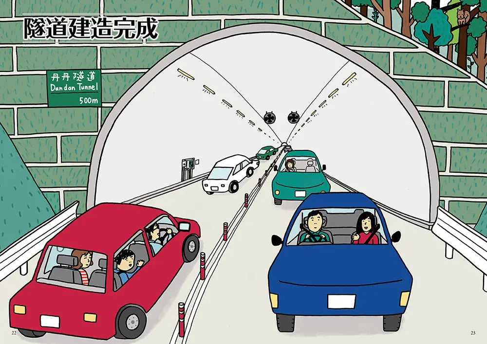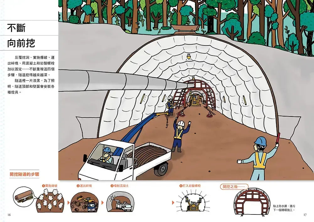 本書透過詳細紀實且富童趣的大跨頁插畫,展現隧道從無到有的開鑿過程:確定隧道位置後,得先用鋼架搭建拱形的出入口,再按照鋼架形狀開挖;以鑽孔機在岩壁上鑿洞後,把炸藥埋入孔洞中,並於遠方引爆;之後藉由側卸式裝載機和砂石車將炸下的砂土與岩塊運出隧道;另外,為防止崩坍,還得出動混凝土噴漿車,在壁面上噴灑混凝土固定土石……施工步驟一覽無遺,宛如親臨開挖現場。