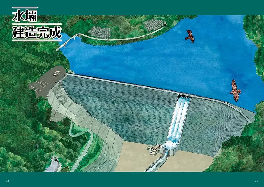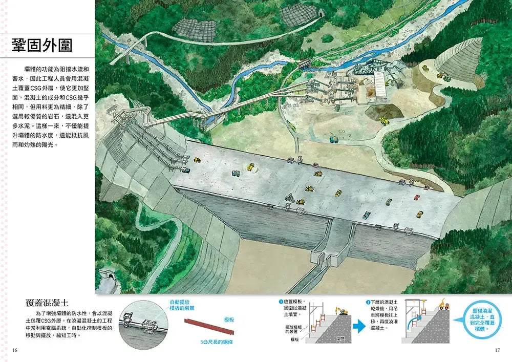 本書透過詳細紀實且富童趣的大跨頁插畫,展現水壩從無到有的建造過程:決定水壩位置後,必須先砍伐樹木,鋪設施工專用道,讓重型機械自由通行;接著清除地面土壤、露出岩層,以坡面切削機調整坡面,再於堅固的岩層上築起壩體;壩體得由底部一層一層往上建造,砂石車運來大量物料後,以推土機推平,再由壓路機反覆壓實,直到壩體初步完成,就可以澆灌混凝土……施工步驟一覽無遺,宛如親臨水壩施工現場。