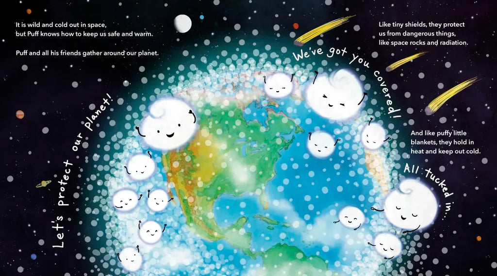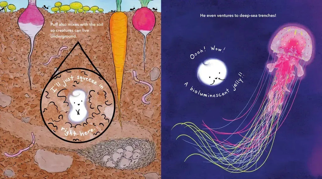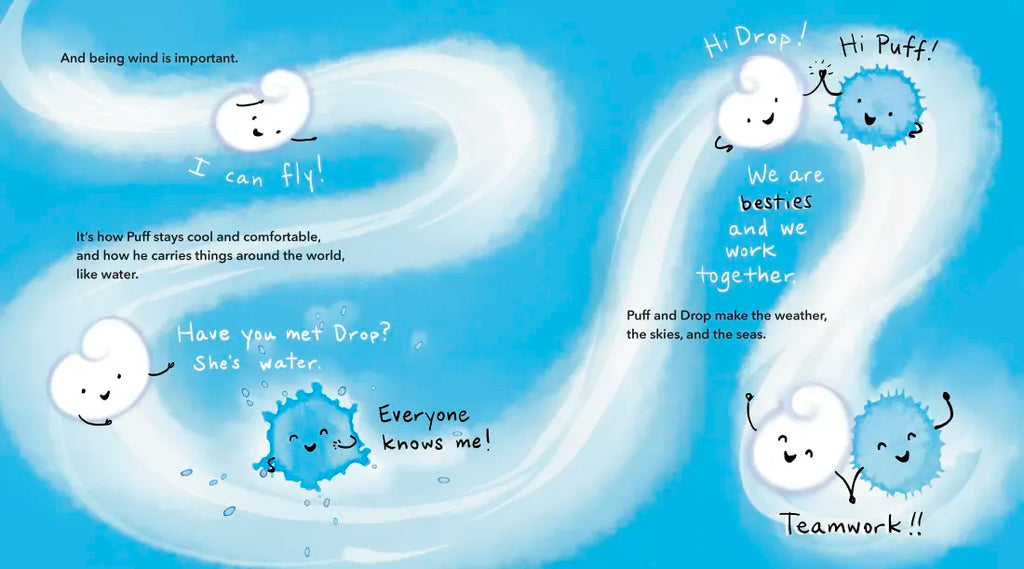 Look who just blew in! Meet Puff. He's air. And he's a gas! Puff has been here for billions of years, forming a blanket of protection around Earth to hold in heat and keep out cold. Puff is key to life—he's the air we breathe and the wind around us. And he's got talent! Have you ever incinerated a space rock? Traveled from the highest heights to the deepest depths of the sea? Or spun through a tornado? Puff has! He'll tell you all about it. With refreshing wit and breezy one-liners, Puff takes readers on an airy adventure through the atmosphere, earth, water, and you. Filled with irresistible artwork, funny asides, and a gentle current of kid-enticing facts, plus endpapers that reveal even more of what air is and how it moves, Puff is the breath of fresh air we’ve all needed.