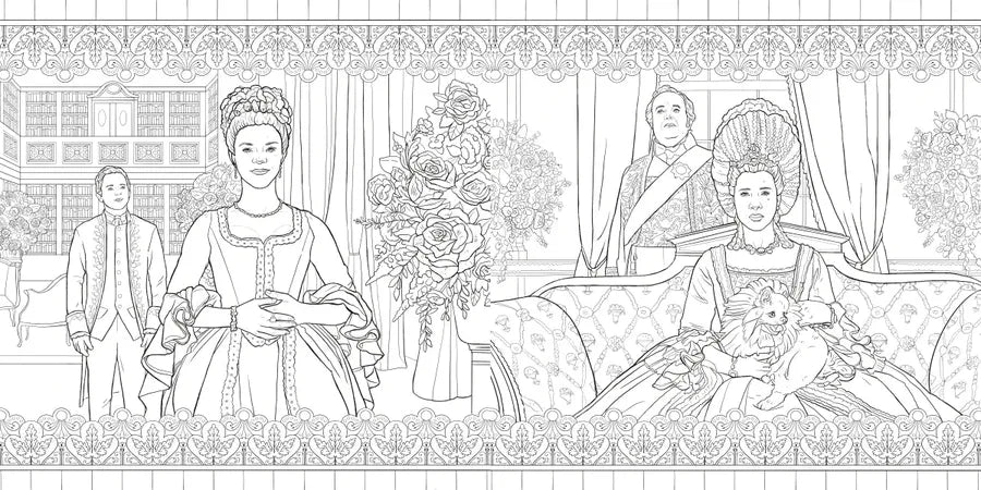 Your presence is requested by her Royal Majesty, Queen Charlotte, to color in all your favorite scenes and characters from Queen Charlotte: A Bridgerton Story, the hugely popular Shondaland limited series on Netflix.