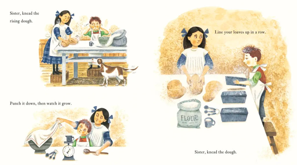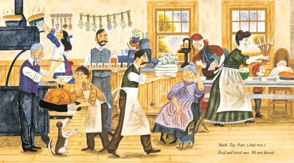 Celebrate food and family with this heartwarming Thanksgiving picture book. We will share the risen bread. / Our made-with-love Thanksgiving spread. / Grateful to be warm and fed. / We will share the bread. In this spirited ode to the holiday, set at the turn of the twentieth century, a large family works together to make their special meal. Mama prepares the turkey, Daddy tends the fire, Sister kneads, and Brother bastes. Everyone—from Grandma and Grandpa to the littlest baby—has a special job to do. Told in spare, rhythmic verse and lively illustrations, Sharing the Bread is a perfect read-aloud to celebrate the Thanksgiving tradition.