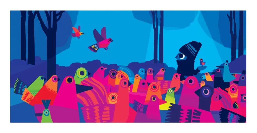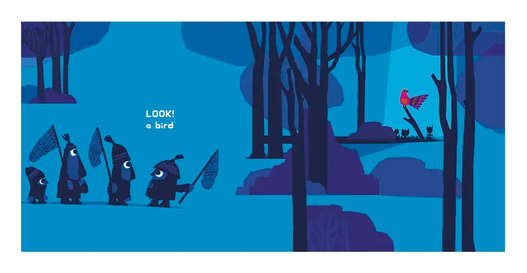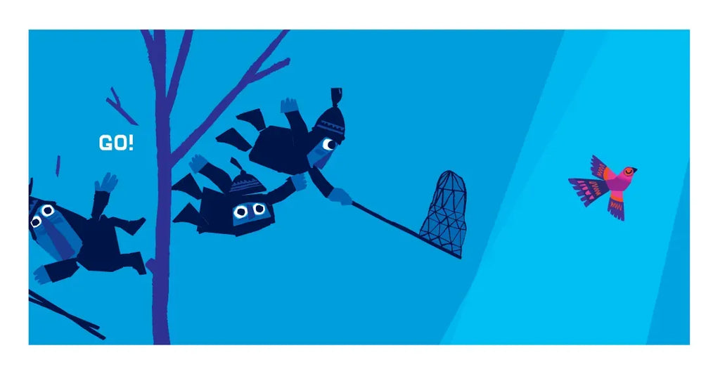 Four friends creep through the woods, and what do they spot? An exquisite bird high in a tree! “Hello birdie,” waves one. “Shh! We have a plan,” hush the others. They stealthily make their advance, nets in the air. Ready one, ready two, ready three, and go! But as one comically foiled plan follows another, it soon becomes clear that their quiet, observant companion, hand outstretched, has a far better idea. Award-winning author-illustrator Chris Haughton is back with another simple, satisfying story whose visual humor plays out in boldly graphic, vibrantly colorful illustrations.