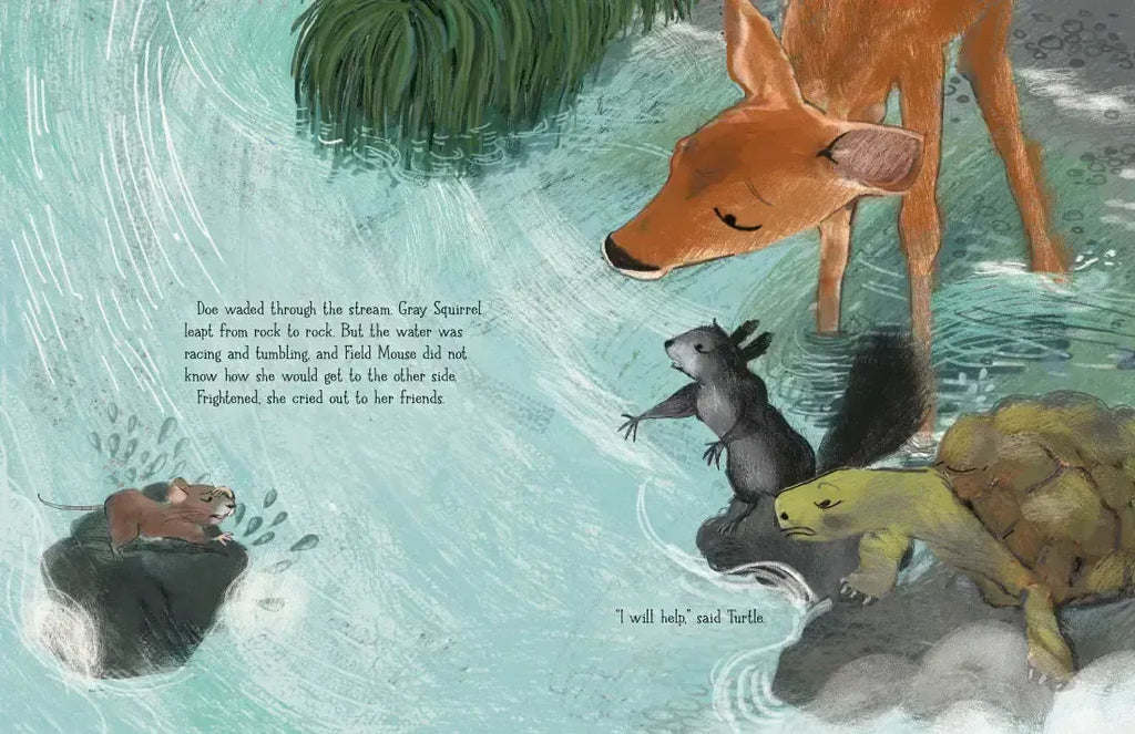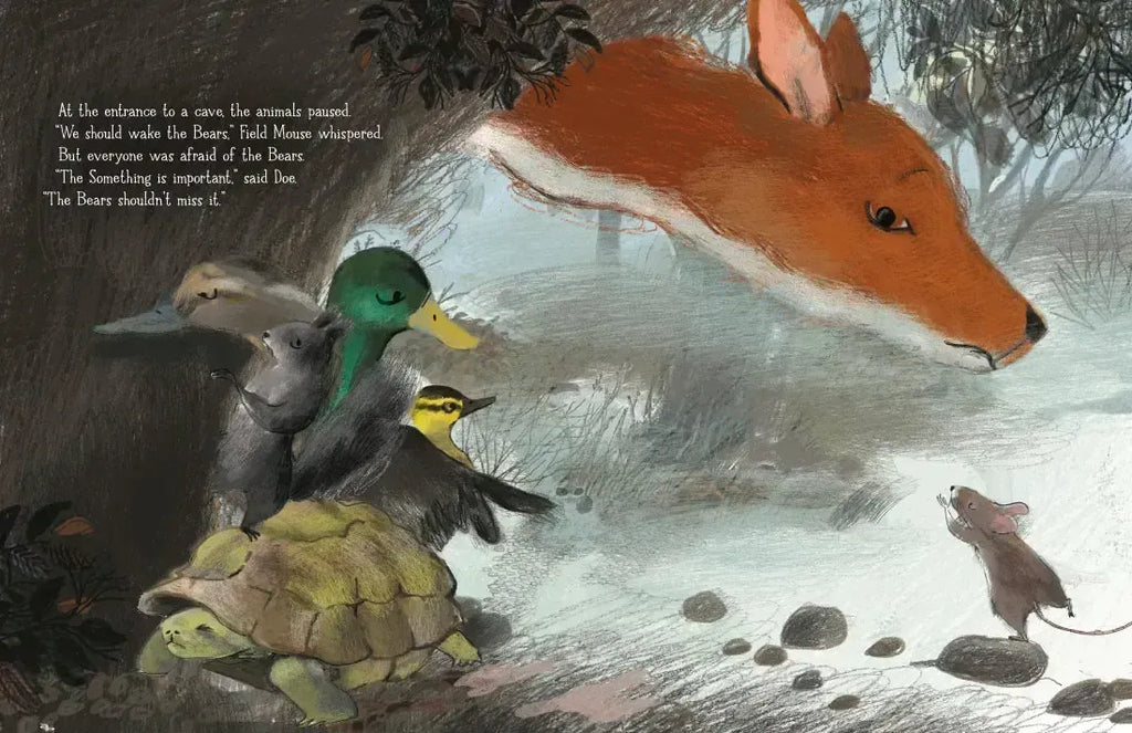 She spots her friend, Squirrel. "Help me find the Something," Mouse tells him. And so the two scamper through a clearing. Soon, they spot Doe. "Where are you hurrying today?" Doe asks them. "We're going to the Hill," says Mouse.